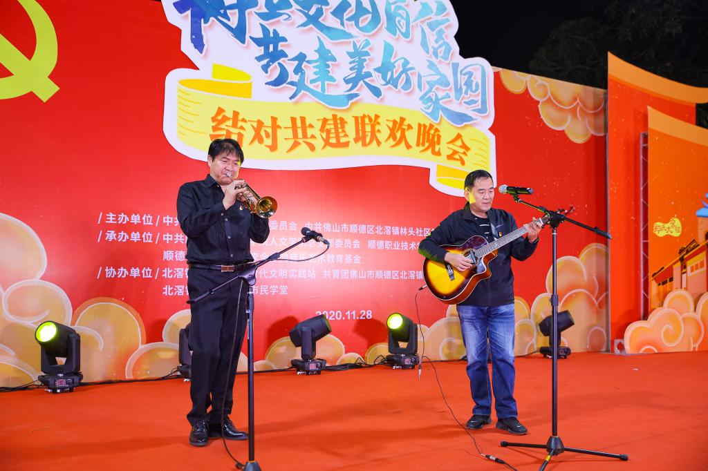 11月28日晚上,人文学院党总支与顺德区北滘镇林头社区党委联合举办了主题为“树立文化自信·共建美好家园”的美育现场结对共建联欢晚会。这场晚会在北滘镇林头社区党群活动中心举行,顺德区委宣传部副部长、区文联主席何鸿佳,学校党委委员、组织人事处处长陈文海,林头社区党委书记梁志能,第一书记何志锋,人文学院党总支副书记、院长刘晓顺,人文学院党总支书记李玉春,林头社区党委副书记梁伟锋,以及人文学院60多名师生党员、20多名学生演职人员、近400名林头社区群众参与了本次晚会。